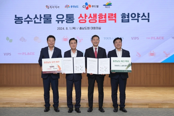 [충청뉴스큐] 예산군은 지난 1일 충남도청 대회의실에서 최재구 예산군수와 김태흠 충남도지사, 김찬호 CJ푸드빌㈜ 대표 등이 참석한 가운데 농산물 판로 확대를 위해 충남도와 글로벌 외식기업인 CJ푸드빌㈜과의 업무협약을 체결했다고 밝혔다.