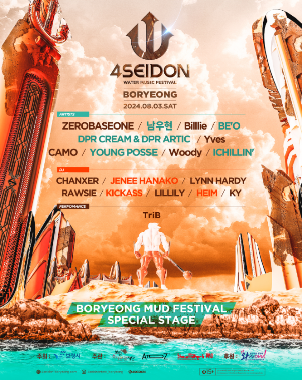 포세이돈 워터뮤직페스티벌에 참여하는 아티스트는 제로베이스원, 남우현, 빌리, 비오, DPR CREAM & DRP ARTIC, 이브, 카모, 영파씨, 우디, 아이칠린 총 10개 팀이 라인업에 올랐다.