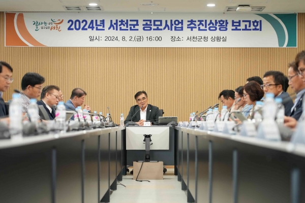 [충청뉴스큐] 서천군은 지난 2일 김기웅 군수를 비롯한 부군수, 부서장 등이 참석한 가운데 군청 상황실에서 지역 발전 동력 마련을 위한 2024년 공모사업 추진상황 보고회를 개최했다.