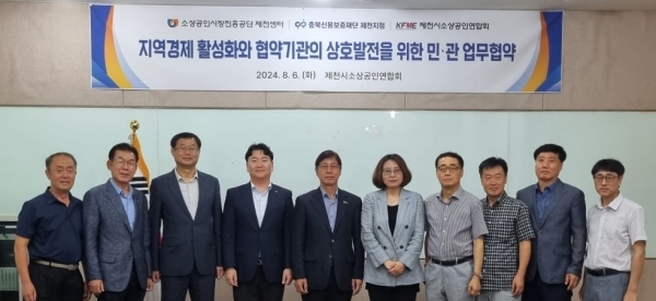 [충청뉴스큐] 소상공인시장진흥공단 제천센터, 충북신용보증재단 제천지점, 제천시 소상공인연합회 등 3개 민관단체는 지난 6일 제천 중앙시장 내 문화센터 강의실에서 지역상권 활성화와 소상공인의 편익 도모를 위한 업무협약을 체결했다.