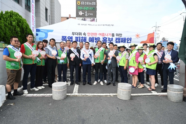 군민안전문화 확산과 폭염 피해 예방 홍보를 위해 실시한 양산쓰기 캠페인은 이용록 홍성군수를 비롯해 지역자율방재단, 안전보안관, 관계공무원 등 40여명이 참여한 가운데 농협하나로마트, 명동상가, 큰시장 일원에서 진행됐으며 군민들에게 양산과 얼음물, 홍보 리플릿 등을 나누어주며 폭염 대비 행동요령을 적극 안내했다.