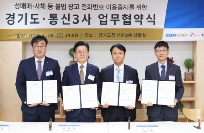 이재명 경기도지사와 이기윤 에스케이티 고객가치혁신실장, 안상근 케이티 수도권강남고객 본부장, 조중연 엘지유플러스 고객가치그룹장은 19일 오후 경기도청에서 ‘성매매·사채 등 불법 광고전화번호 이용중지’를 위한 협약을 체결했다.