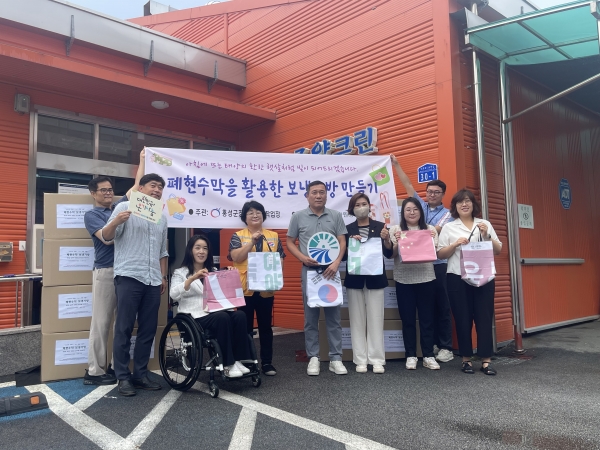 [충청뉴스큐] 홍성군과 한국지체장애인협회 홍성군장애인보호작업장 조양크린이 폐현수막 재활용 프로젝트를 성공적으로 마무리하며 8일 폐현수막 보냉가방 전달식을 진행했다.