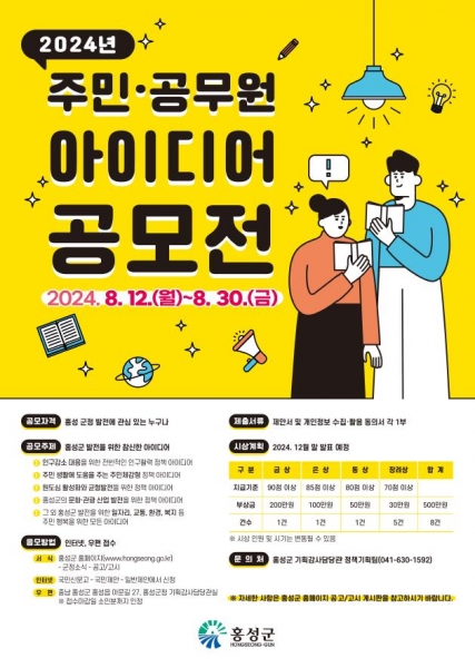 [충청뉴스큐] 홍성군이 다양한 계층의 창의적 아이디어를 수렴해 군정 발전의 새로운 동력을 마련하고 주민 참여를 활성화하기 위해 ‘2024년 주민·공무원 아이디어 공모전’을 개최한다.