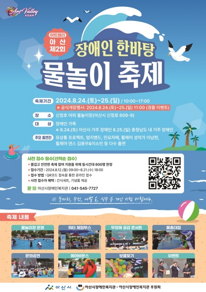 [충청뉴스큐] 아산시와 아산시장애인복지관, 아산시장애인복지관 후원회는 오는 24일과 25일 2일에 걸쳐 신정호 야외 물놀이장에서 장애인 가족을 대상으로 ‘아트밸리 아산 제2회 장애인 한바탕 물놀이 축제’를 개최한다.