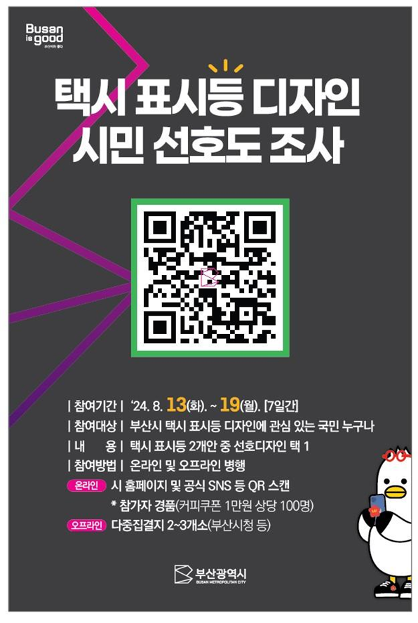 [충청뉴스큐] 부산시는 오늘부터 19일까지 7일간 '택시 표시등' 디자인 선호도 조사를 실시한다고 밝혔다.