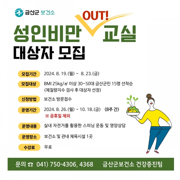 성인 비만 아웃 교실에 관한 자세한 내용은 금산군보건소 건강증진팀에 문의하면 된다.