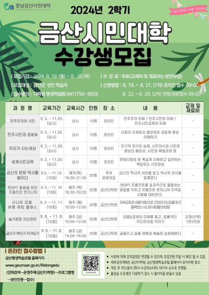 충남금산시민대학 2학기 강좌별 일정 등 세부 정보는 금산평생학습포털 공지사항에서도 확인할 수 있다.