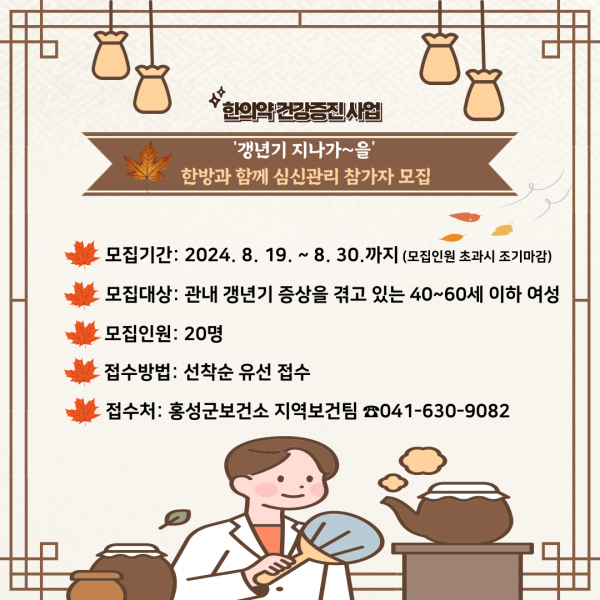 [충청뉴스큐] 홍성군보건소가 한의약 건강증진사업의 일환으로 갱년기 예방을 위해 한방과 함께 심신관리 프로그램 ‘갱년기 지나가~을’ 참가자를 8월 19일부터 2주간 모집한다.