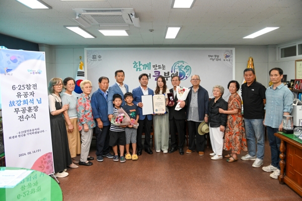 [충청뉴스큐] 부여군은 지난 14일 군수실에서 6·25전쟁 참전유공자 故강희석님의 무공훈장 전수식을 가졌다.