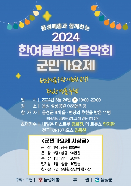 [충청뉴스큐] 음성군은 오는 24일 오후 7시 음성 설성공원 야외음악당 일원에서 여름밤의 무더위를 잊게 할 ‘2024 한여름밤의 음악회 및 군민가요제’를 개최한다고 밝혔다.