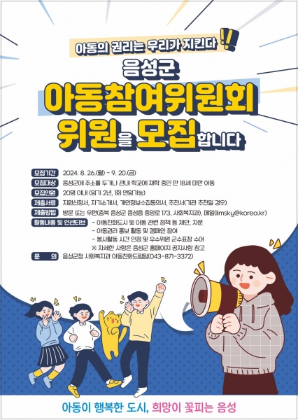[충청뉴스큐] 음성군은 아동친화도시 조성의 일환으로 아동의 의견을 정책에 반영하고 아동의 권익증진을 도모하기 위한 2024년 아동참여위원회 위원을 공개 모집한다고 26일 밝혔다.