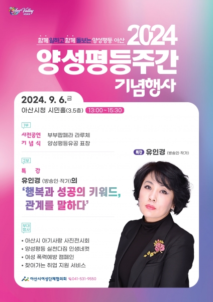 양성평등주간을 맞아 일상생활 속 작은 실천으로 양성평등 아산을 만드는 데 동참해 주시길 바라며 이번 양성평등주간 기념행사에 많은 관심과 참여 부탁드린다”고 말했다.