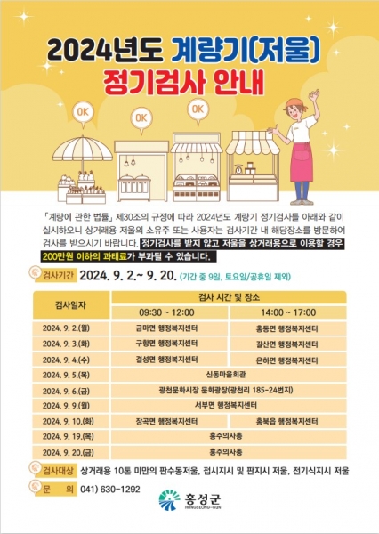 [충청뉴스큐] 홍성군이 건전한 상거래 질서 확립과 소비자 권익보호를 위해 9월 2일부터 20일까지 법정 계량기 정기검사를 실시한다.