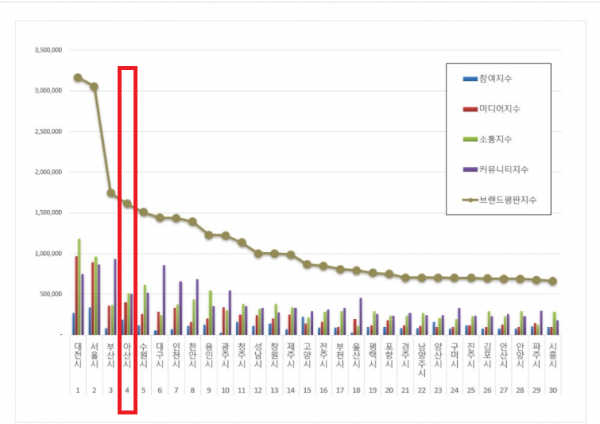 [충청뉴스큐] 아산시가 8월 한국기업평판연구소의 대한민국 도시브랜드 평판 순위에서 4위를 기록하며 다시 한번 전국 상위권에 이름을 올렸다.