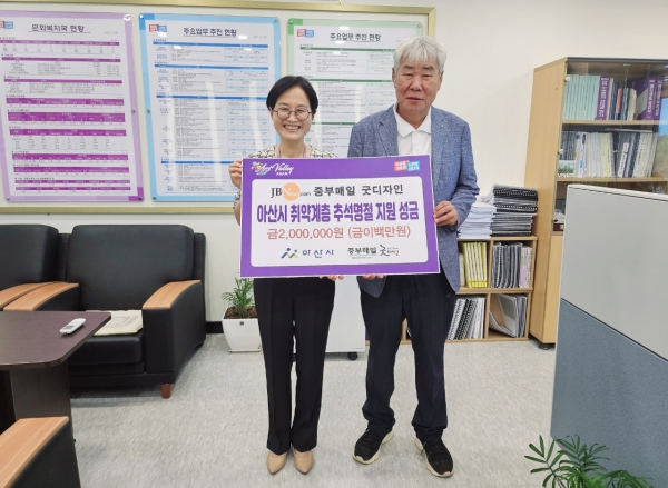 이현경 문화복지국장은 “추석 명절을 맞아 취약계층을 위해 나눔을 실천해 주신 중부매일 굿디자인에게 감사드리며 어려운 이웃에게 보내주신 따뜻한 마음을 잘 전달하겠다”고 감사의 마음을 전했다.