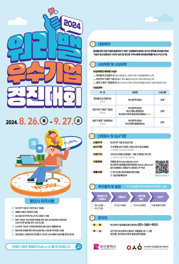 [충청뉴스큐] 부산시는 일·생활 균형 직장환경 조성과 문화 확산을 위해 오는 9월 27일까지 ‘2024 워라밸 우수기업 경진대회’ 참가기업을 모집한다고 밝혔다.