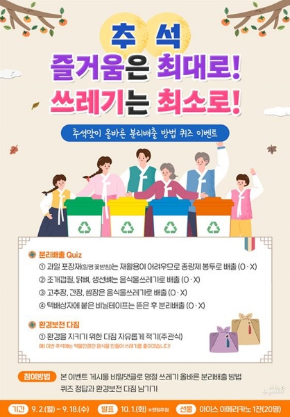 또한 ‘추석맞이 올바른 분리배출 퀴즈 이벤트’, 전광판, SNS 및 블로그 게재 등 다양한 홍보 매체를 통해 시민들의 자발적인 명절 쓰레기 분리수거 및 감량을 유도할 계획이다.