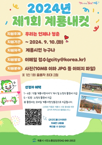 이번 계룡내컷 공모전은 ‘우리는 언제나 청춘’ 이라는 주제로 계룡의 일상을 찍은 사진 파일 1장과 지원서를 이메일로 제출하면 되며 계룡시민이라면 누구나 참여 가능하다.