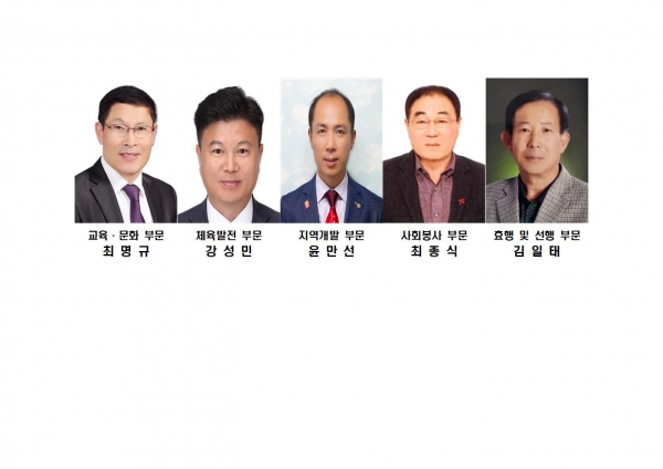 수상자는 △교육·문화 부문 최명규님, △체육발전 부문 강성민님, △지역개발 부문 윤만선님, △사회봉사 부문 최종식님, △효행 및 선행 부문 김일태님이 각각 선정됐다.