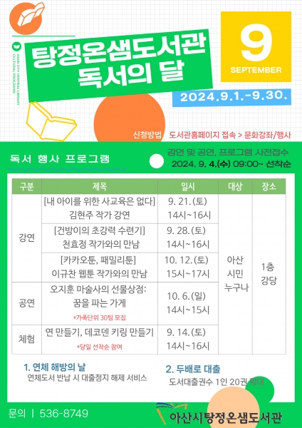 [충청뉴스큐] 아산시 탕정온샘도서관이 9월 독서의 달을 맞아 다양한 행사를 운영한다.