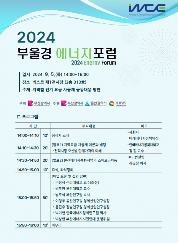 [충청뉴스큐] 부산시는 울산시, 경상남도와 오늘 오후 2시 벡스코에서 지역별 전기요금 차등제 공동 대응 방안을 주제로 '2024년 부울경 에너지포럼'을 개최한다고 밝혔다.