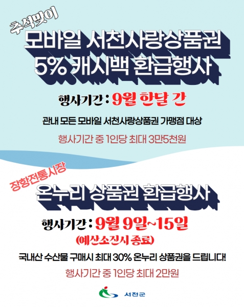 [충청뉴스큐] 서천군은 민족 대명절인 추석을 맞아 9월 한달간 모바일 서천사랑상품권 5% 캐시백 행사를 실시한다.