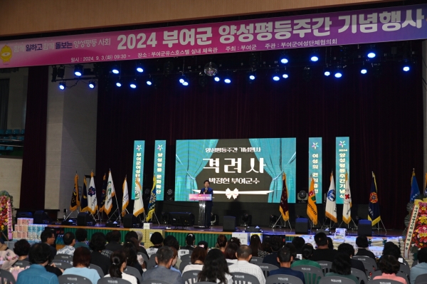 [충청뉴스큐] 부여군과 부여군여성단체협의회는 지난 3일 부여군유스호스텔 실내체육관에서 박정현 부여군수와 여성단체협의회 회원, 역대 고문, 기관 단체장 등이 참여한 가운데 2024년 부여군 양성평등주간 기념행사를 개최했다.