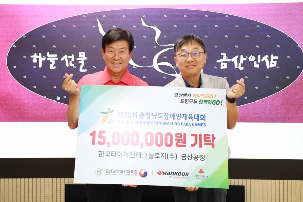 [충청뉴스큐] 한국타이어 금산공장은 지난 4일 제30회 충남도장애인체육대회의 성공적인 개최를 위해 금산군장애인체육회에 후원금 1500만원을 전달했다.