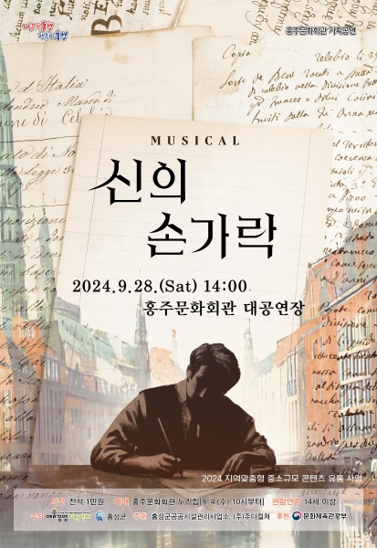 [충청뉴스큐] 홍성군 홍주문화회관이 문화체육관광부와 예술경영지원센터의 ‘2024년 지역맞춤형 중소규모 콘텐츠 유통사업’ 공모에서 선정된 뮤지컬 ‘신의 손가락’을 9월 28일 오후 2시에 선보인다.