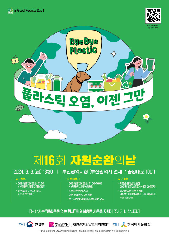 [충청뉴스큐] 부산시는 오늘 오후 1시 30분 시청 대강당에서 '플라스틱 오염, 이젠 그만'을 주제로 ‘제16회 자원순환의 날’ 기념식을 개최한다고 밝혔다.