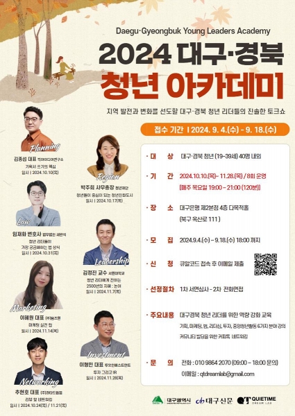 [충청뉴스큐] 대구광역시와 대구신문는 대구경북 지역청년들을 대상으로 2024 대구경북 청년아카데미 참가자를 9월 18일까지 모집한다.