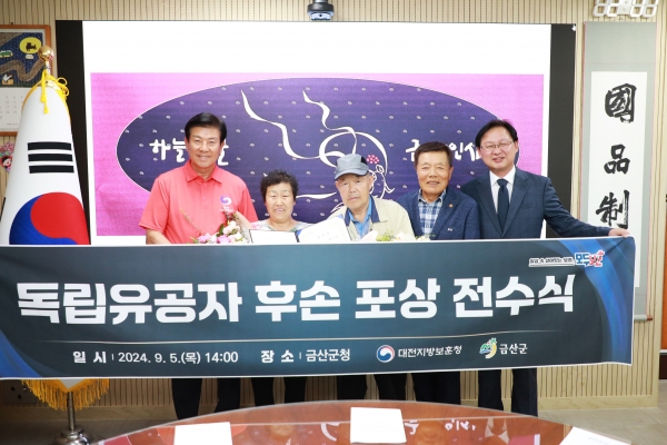 [충청뉴스큐] 금산군은 지난 9월 5일 국가보훈부 대전지방보훈청과 함께 금산군청에서 독립유공자 고 원인성 지사의 손자 원동수 씨에게 대통령 표창을 전수했다.