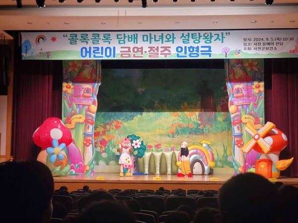 [충청뉴스큐] 서천군보건소는 지난 5일 관내 어린이집 및 유치원생 350여명을 대상으로 흡연·음주예방 인형극 ‘콜록콜록 담배마녀와 설탕왕자’ 공연을 선보였다.