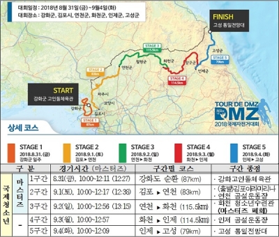 [충청뉴스Q] 행정안전부, 인천, 경기, 강원도가 공동주최하고 대한자전거연맹이 주관하는 ‘뚜르 드 디엠지 2018 국제자전거대회’가 오는 31일부터 9월 4일까지 5일간 비무장지대와 접경지역 일원에서 열린다.