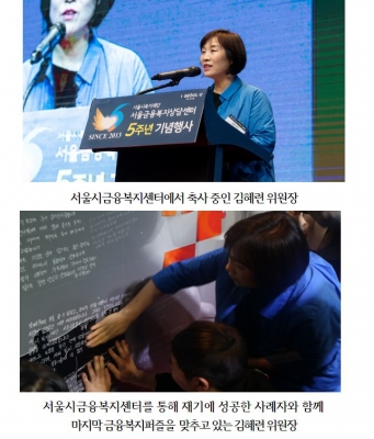 [충청뉴스Q] 서울시의회 보건복지위원장 김혜련은 지난 28일 여의도에서 열린 서울금융복지상담센터 5주년 기념행사에서 서울금융복지상담센터가 4,500명에게 금융상담을 실시하여 1조 원 넘는 부채를 해결하는 등 ‘가계부채 해결을 위한 비상구’ 역할 수행과 실적을 격려하며, 서민부채 비율 증가추세에 보다 선제적인 적극 대응을 주문했다.