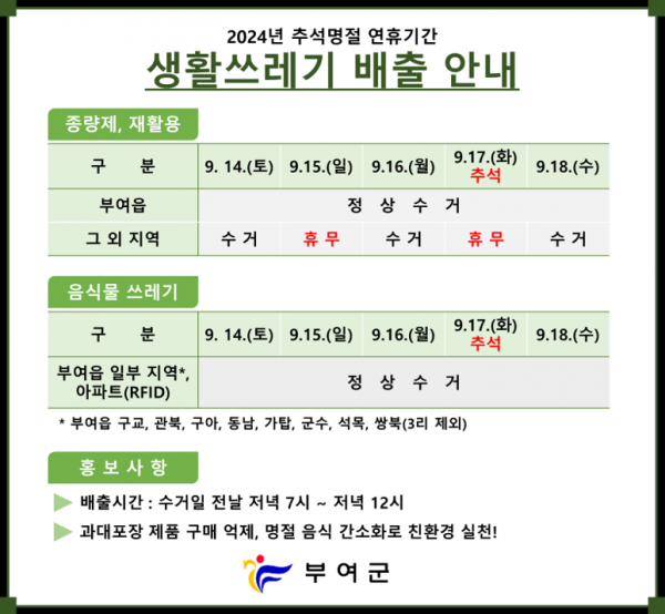 아울러 종량제와 재활용, 음식물 쓰레기 수거는 부여읍 지역은 정상수거하고 그 외 지역은 9월 14일과 16일 18일만 수거할 예정으로 그 외 지역은 수거일 전날 저녁 7시에서 12시 사이 생활쓰레기를 배출해야 한다.