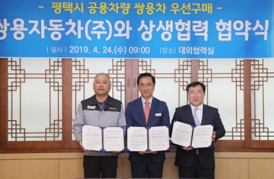 [충청뉴스큐] 정장선 평택시장은 24일 시청 대외협력실에서 예병태 쌍용자동차 대표이사, 정일권 노조위원장과 쌍용차 정상화 일환으로 공용차량 쌍용차 우선 구매 확대를 위한 평택시와 쌍용차 노사간 상생협약을 체결했다.