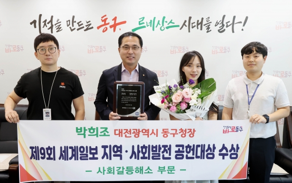 박 청장은 ‘진심’과 ‘소통’을 바탕으로 민선 8기 출범부터 영유아 부모·청소년·학부모·청년서포터즈 등 다양한 계층의 주민들을 만나 현장의 목소리를 듣고 이를 정책에 반영하는 등 지역사회 통합을 위해 노력한 결과, 상생과 화합의 동구를 선도하는 공로를 인정받아 ‘사회갈등해소’ 개인부문 대상 수상자로 선정됐다.