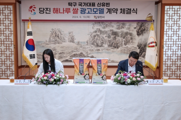 19일 당진시청에서 열린 체결식에는 오성환 당진시장과 신유빈 선수가 참석해 해나루쌀 광고모델 계약을 체결했다.