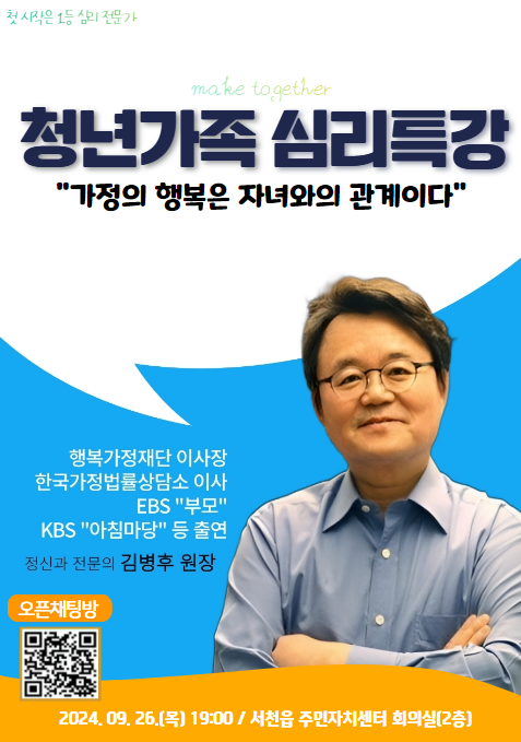 [충청뉴스큐] 서천군은 청년 가족의 심리적 건강 증진과 행복한 가정 만들기를 위해 오는 26일 저녁 7시 서천읍주민자치센터 나눔2실에서 심리특강을 개최한다.