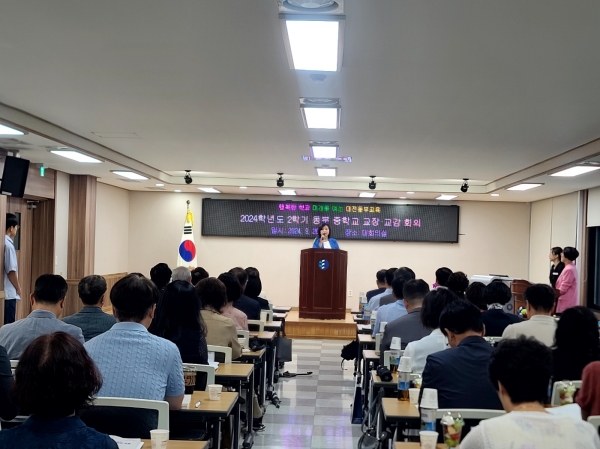 [충청뉴스큐] 대전동부교육지원청은 2024.9.1.자 인사이동에 의한 교육공무원 소개와 2학기 주요업무 안내를 위해 9월 20일 대회의실에서 2024학년도 2학기 중학교 교장 및 교감 회의를 개최했다고 밝혔다.