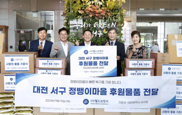 기탁식은 지난 7월 수해로 큰 피해를 본 기성동 정뱅이마을 주민들을 지원하고자 마련됐으며 서철모 서구청장을 비롯해 월드브릿지 임원진과 지역 시의원, 구의원 등이 참석했다.