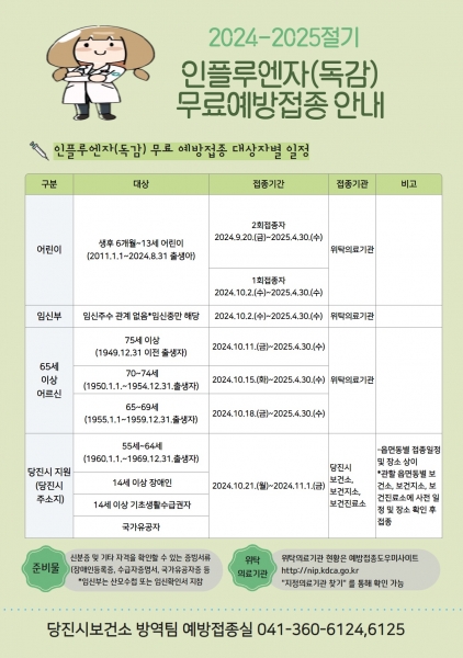 또한 당진시는 자체 사업으로 55~64세 당진시민, 14세 이상 기초생활수급자, 장애인, 국가유공자 대상 무료 예방접종을 10월 21일부터 당진시 보건소, 보건지소, 보건진료소에서 실시한다.