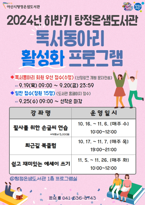 [충청뉴스큐] 아산시 탕정온샘도서관이 10월부터 ‘독서동아리 활성화 프로그램’을 운영한다.