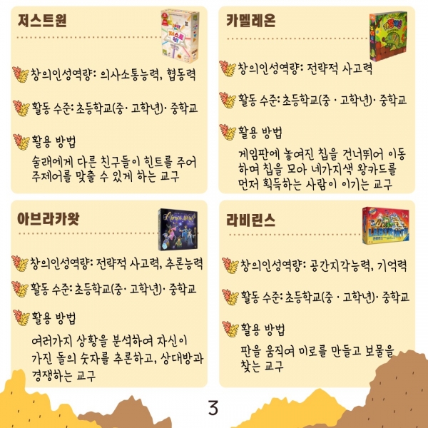 보유하고 있는 204종의 교구 중 학교 대여 횟수가 많고 창의인성 수업 활용도가 높은 교구 4종 20꾸러미를 관내 초⋅중학교 20교 선정 후 1개 학급 분량의 교구 1종과 활동지 및 수업 지원 동영상을 보급하고 교원을 대상으로 교구 활용 연수도 실시했다으로써 창의인성교육 활성화를 도모할 예정이다.