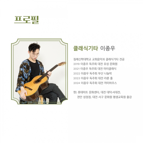 클래식 기타리스트 이종우의 기타 연주로 영화‘금지된 장난’의 OST인 로망스부터 영화 ‘괴물’의 OST인 눈 오는 매점까지 다양한 공연을 펼칠 예정이며 관람료는 무료이다.