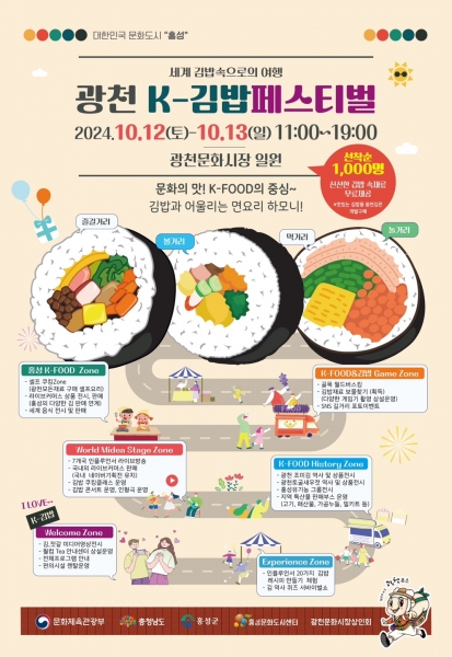 홍성군에 따르면 글로벌 K-푸드 혁명을 이끄는 조미김의 대표 생산지 광천읍에서 오는 10월 12일부터 13일까지 이틀간 김밥 페스티벌을 개최한다.