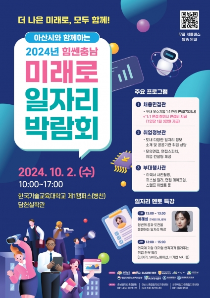 [충청뉴스큐] 충청남도가 주최하고 아산시와 천안시가 함께하는 ‘충남 미래로 일자리 박람회’ 가 오는 10월 2일 천안시 병천면 한국기술교육대학교에서 개최된다.