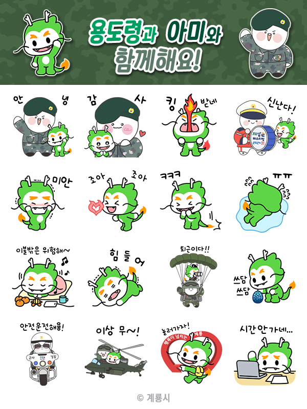 특히 이번 이모티콘 배포는 육군의 지상군페스티벌 홍보 캐릭터 ‘아미’ 와 콜라보를 진행해 귀여운 ‘용도령’ 캐릭터와 절도 있는 ‘아미’를 함께 만나볼 수 있다.